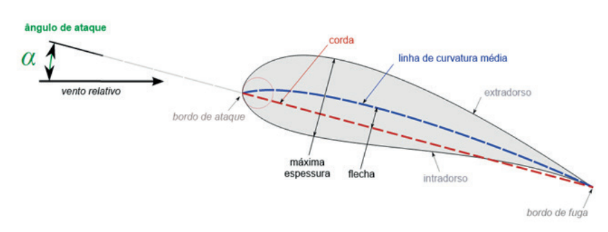 Revendo o que já estudamos sobre perfis na materia de teoria de voo, a figura a seguir identifica as principais nomenclaturas básicas de um perfil, onde pode ser observada a linha da Corda Média Aerodinâmica.