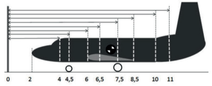 Seja a aeronave representada com as respectivas estações indicadas na figura anterior. O seu CGPV é fornecido pelo fabricante, mas para efeitos de exercício, será calculado aqui, considerando que uma pesagem efetuada com balanças sob as rodas do trem de pouso (os pontos de apoio para pesagem de uma aeronave são denominados “pontos de pesagem”) forneceu as seguintes medições: