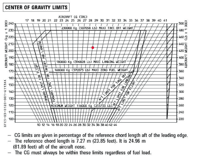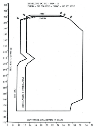 As duas figuras a seguir representam envelopes de CG de duas aeronaves comerciais, respectivamente, do trijato McDonnell Douglas MD-11 e do Airbus A330. Repare que o fabricante define envelopes (passeios) do CG mais restritivos para as operações de decolagem e pouso, haja vista a necessidade de controle da aeronave mais apurado nessas fases de voo, e pela incapacidade do conjunto estabilizador horizontal / profundor de gerar as forças de equilíbrio em grandes quantidades, em função do baixo regime de velocidade empregado.