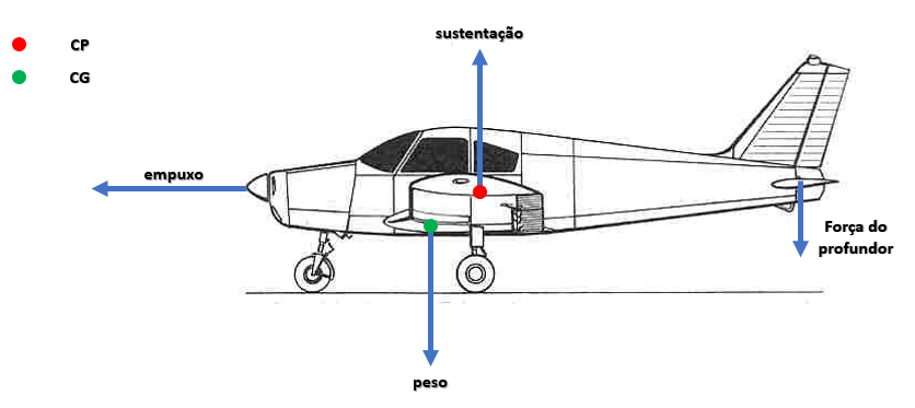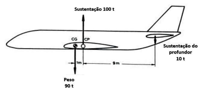 Por encontrar-se à direita do CG (ou seja, para trás da aeronave, em direção à cauda), o Centro de Pressão (CP) – no qual atua a resultante da sustentação das asas, funciona como o ponto de apoio de uma gangorra, conforme descrevem as figuras abaixo.