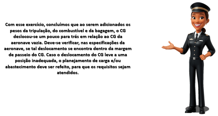 Ao longo do voo, logicamente ocorrerá uma redução na quantidade de combustível a bordo da aeronave. É de se esperar, então, que o CG deve permanecer dentro dos limites definidos pelo fabricante, mesmo após consumido o combustível. Assim, qual será a posição do CG da aeronave do exemplo anterior, depois de consumido todo o combustível?