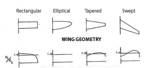 A figura abaixo ilustra a distribuição do Coeficiente de Sustentação, em várias geometrias de asa.