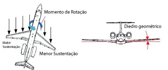 Isso é causado pelo chamado Efeito Diedro. Quando as asas são projetadas de modo que sejam “dobradas” para cima, diz-se que elas possuem um diedro geométrico positivo. Esse diedro geométrico produz o seguinte efeito aerodinâmico: se em voo, por qualquer motivo uma das asas cair, o consequente deslocamento lateral faz com que a aeronave volte à situação de nivelamento das asas. Em outros termos, o diedro nas asas provoca rolamento devido à guinada lateral.