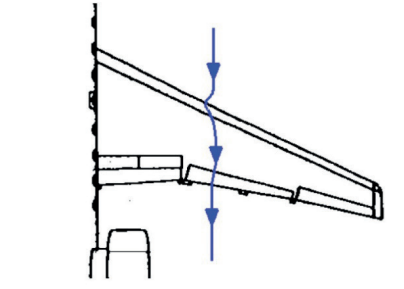 Você já deve ter visto, em voo, que uma asa se enverga em determinadas situações (por exemplo, quando a aeronave sai do solo, ou quando passa por uma zona de turbulência). Pois é, e saiba que isso é normal e que ela foi construída para reagir exatamente dessa forma. Ou seja, ela é construída de maneira suficientemente elástica, para poder oscilar. Assim, quando submetida a tais forças de pressão que a empurram para cima, a asa enverga ou deflexiona, tomando um formato que, visto de frente, assemelha-se ao de um ângulo de diedro de uma asa (como na figura abaixo).