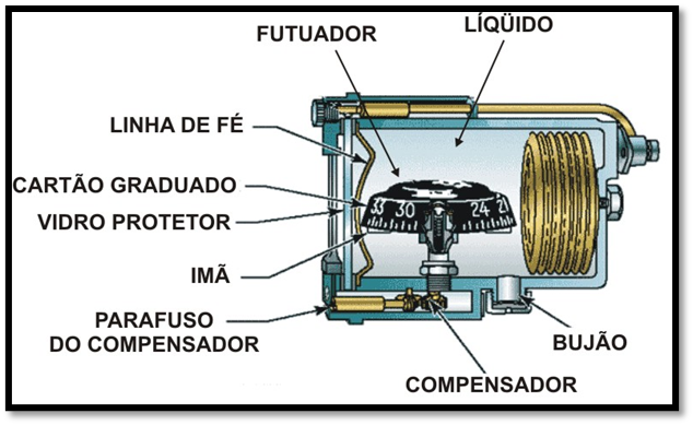 Basicamente, a bússola magnética se compõe de um imã montado sobre uma superfície circular ou cônica graduada que, suspensa sobre um pivô, tenderia a se alinhar com a direção Norte-Sul magnética da superfície terrestre, indicando ao piloto o valor angular que a direção do eixo longitudinal da aeronave faz com o que chamamos de Norte Magnético (NM).