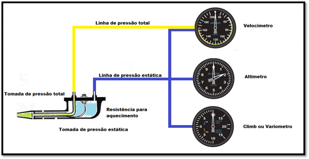 Alguns instrumentos se utilizam do tubo de pitot para funcionar. O tubo de pitot nada mais é que um tudo localizado num ponto da aeronave em que fique paralelo a linha do vento relativo, destinado a captar pressões estática e dinâmica, as quais são levadas para os instrumentos que funcionam mediante ação direta dessas pressões, são eles: o altímetro, o velocímetro e o climb ou variometro. Essas pressões são levadas aos instrumentos através de uma linha de pressão ilustrada na imagem abaixo.