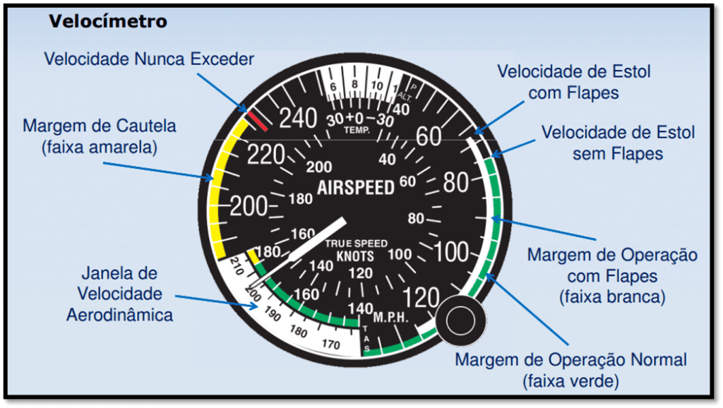 O Velocímetro dos aviões possui diversas faixas de operação, cada qual com características e limitações próprias. Veja na imagem abaixo essas faixas e as limitações que elas impõem. Lembrando que, essas limitações variam de aeronave para aeronave. A imagem abaixo ilustra apenas limitações fictícias como exemplo.