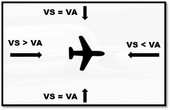 Velocidade no solo (VS) – É a velocidade resultante do efeito do vento em relação ao deslocamento da aeronave na superfície da Terra. Para ter um raciocínio correto é importante relacionar a VS com a VA.