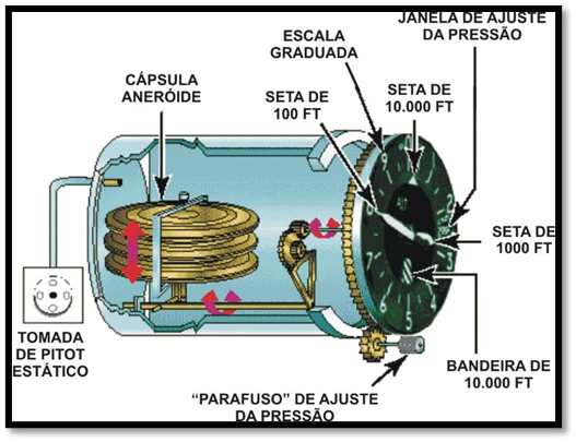 A diferença de pressão provoca um movimento de vaivém na capsula aneroide, dilatando-se sempre que a aeronave estiver subindo por encontrar menores pressões e contraindo-se sempre que a aeronave estiver descendo, por encontrar maiores pressões. Esse movimento de vaivém, por sua vez, provoca o movimento dos ponteiros no mostrados do altímetro.