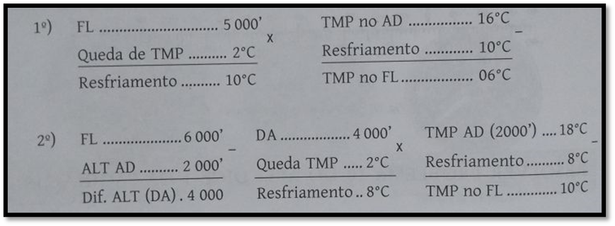 Com base na informação dada sobre o aquecimento ou resfriamento do ar na razão de 2°C para cada 1000 pés, é fácil determinar a temperatura em qualquer nível por intermédio de cálculos aritméticos. Observe os exemplos abaixo: