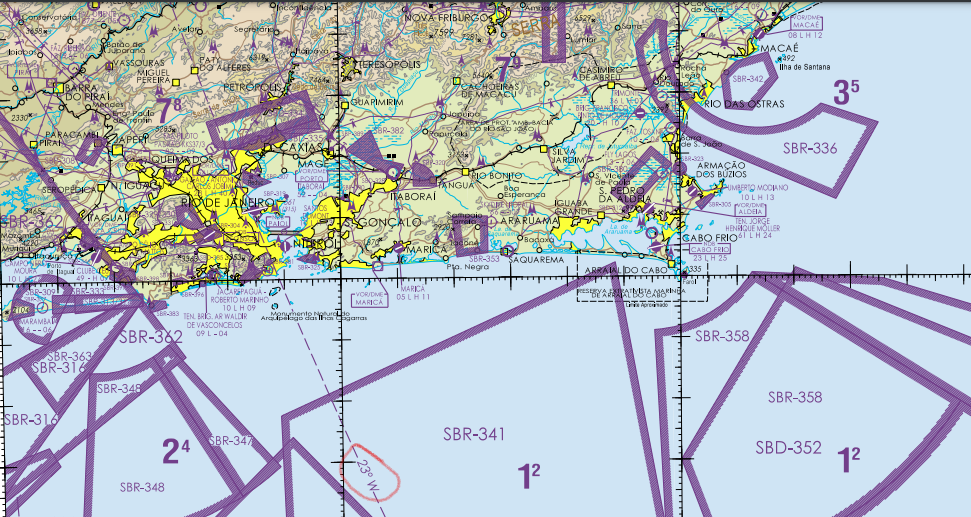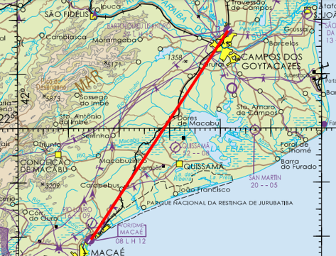 Em uma carta WAC riscar uma linha reta entre os pontos, por exemplo, na carta abaixo queremos saber a distância do aeródromo de Macaé até o aeródromo de Campos.