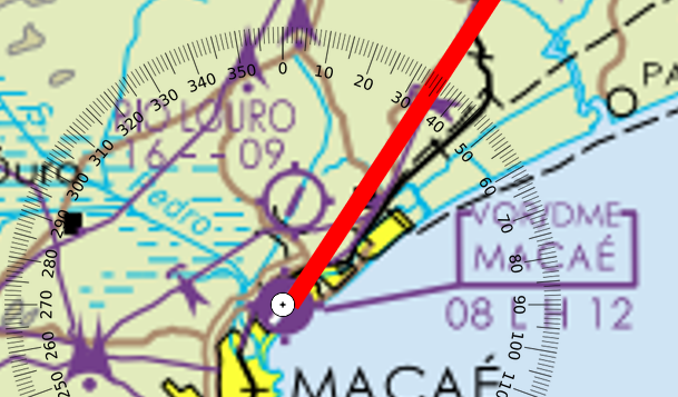 Seguindo o exemplo anterior e ajustando um transferidor sobre o aeródromo de Macaé, com marcação Norte para cima. Temos o valor de 35º para rumo verdadeiro.