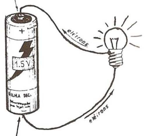 Corrente Elétrica – Uma pilha sozinha não produz corrente elétrica, porque o ar não permite a passagem dos elétrons livres. Porém, se ligarmos os terminais através de fios condutores e uma lâmpada, formar-se-á uma corrente de elétrons livres que são repelidos do terminal negativo e atraídos para o positivo (dentro da pilha, esses elétrons são forçados a se deslocar ao terminal negativo pela energia química). O caminho seguido pela corrente elétrica denomina-se circuito elétrico.