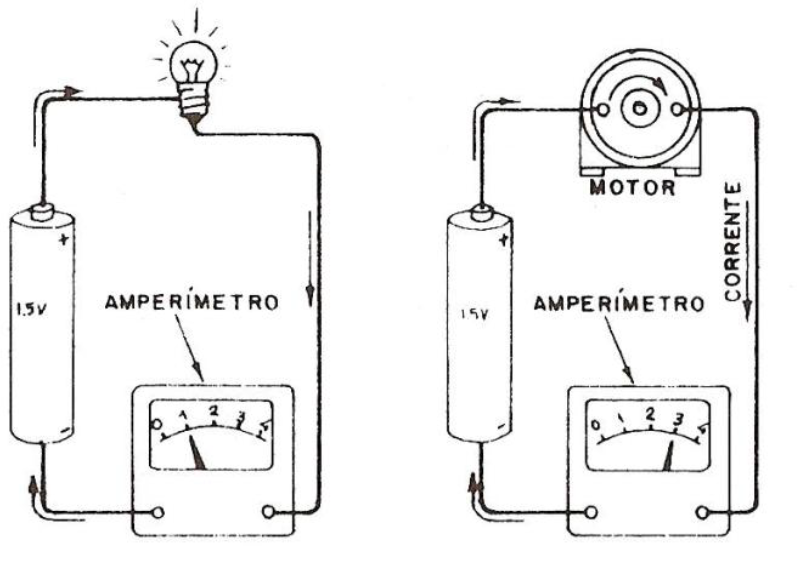 A corrente elétrica é medida em ampéres, através de amperímetros. Na figura abaixo, o amperímetro mostra que uma determinada lâmpada permite passar uma corrente de 1 A (um ampére) e o motor 3 A. Isso significa que a lâmpada oferece mais resistência à passagem da corrente elétrica.