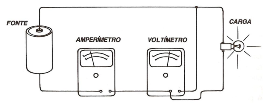 Medidas de tensão e corrente num circuito – A tensão deve ser medida com um voltímetro, ligado em paralelo com a fonte ou a carga em questão. A corrente deve ser medida com um amperímetro intercalado em série no circuito (ou seja, é preciso interromper o circuito e inserir o amperímetro, para que a corrente a ser medida passa através do mesmo).