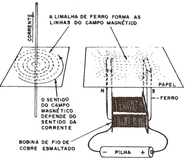 Eletromagnetismo – O campo magnético forma-se também ao redor de um fio onde há uma corrente elétrica, no plano perpendicular ao mesmo, conforme mostra a figura. Isso é aproveitado para construir os eletroímãs, que têm a vantagem de poderem ser desligados, o que não é possível com os ímas permanentes.