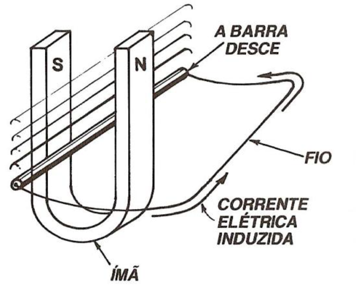 Indução eletromagnética – Quando um fio é movimentado dentro de um campo magnético, surge uma força eletromotriz nesse fio. Esse fenômeno chama-se indução eletromagnética e a experiência é conhecida como experiência de Faraday. Uma de suas aplicações é o gerador elétrico, que produz eletricidade através da energia mecânica.