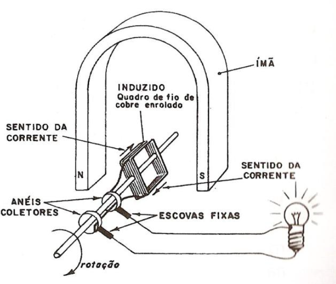 Alternador – É um gerador que produz corrente alternada. A figura mostra esquematicamente um alternador elementar, formado por uma bobina em forma de quadro que fira entre os pólos de um íma. O campo magnético do imã é imutável, mas cada lado do quadro giratório troca de posição com o lado oposto a cada meia-volta, invertendo o sentido da corrente. Por isso a corrente gerada é alternada.