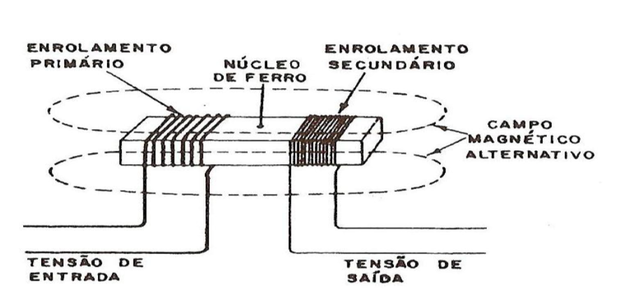Transformador – É um dispositivo baseado na indução eletromagnética, permitindo alterar uma tensão alternada. A figura ao lado mostra esquematicamente a sua construção.