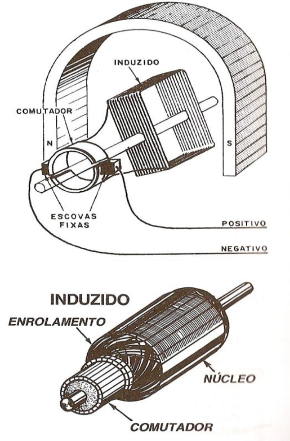 Dínamo – É um gerador que fornece corrente contínua. É a principal fonte de energia elétrica do avião e carrega a bateria. A figura mostra um dínamo elementar. Podemos observar que é semelhante ao alternador elementar estudado no item 18, mas os anéis coletores são substituídos pelo comutador, que retifica a corrente alternada produzida no induzido, transformando-a em corrente contínua. Neste dínamo elementar, a corrente coletada pelas escovas não é exatamente contínua porque existe apenas uma bobina no induzido. Num dínamo real, porém, existem muitas bobinas (ver o induzido ilustrado ao lado), de modo que as ondulações da corrente diminuem consideravelmente, tornando a corrente praticamente contínua. As bobinas desse induzido são enroladas num núcleo de ferro cilíndrico, porque o ferro oferece melhor passagem ao campo magnético que o ar.