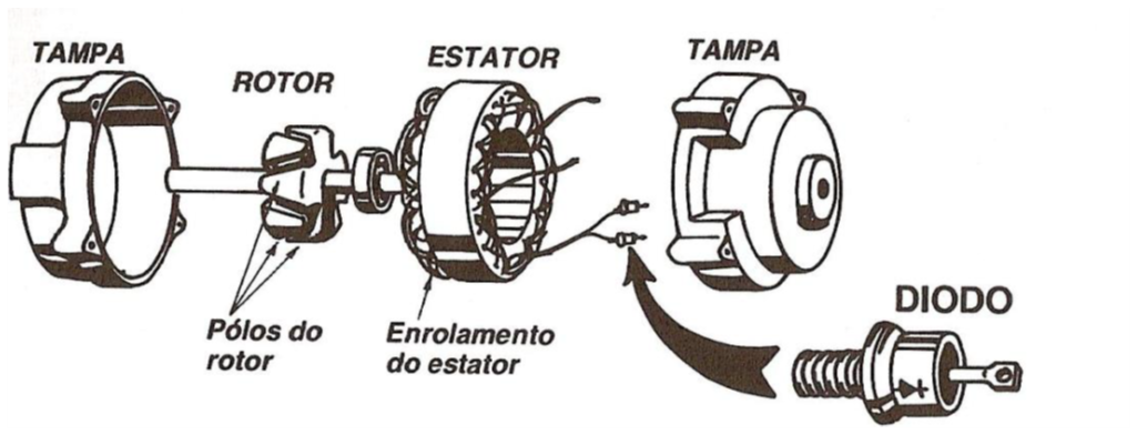 Diodo – O diodo é um dispositivo que permite a passagem da corrente num só sentido. Uma de suas funções é a retificação da corrente alternada. Dessa forma, um alternador ( que é construído para fornecer corrente alternada) pode fornecer corrente contínua, substituindo o dínamo.