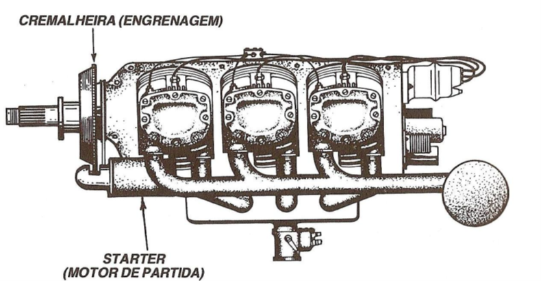 “starter” – É o motor de partida, acionado pela bateria do avião ou uma bateria externa ligada ao avião através de uma tomada na fuselagem. Funciona como o motor de partida dos automóveis. Através da chave de ignição. Alguns aviões de treinamento não possuem motor de partida. Nesse caso, uma pessoa treinada dará a partida manualmente através da hélice.