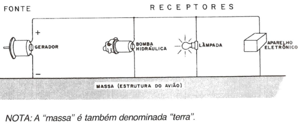 Circuitos com retorno pela massa – Nos aviões de estrutura metálica são utilizados circuitos com retorno pela massa, ou seja, todos os componentes são alimentados com um só fio (geralmente o dispositivo), e o retorno da corrente é feito pela própria estrutura do avião ou carcaça do motor. Isso simplifica o sistema elétrico e reduz o peso, a complexidade e a possibilidade de falhas.